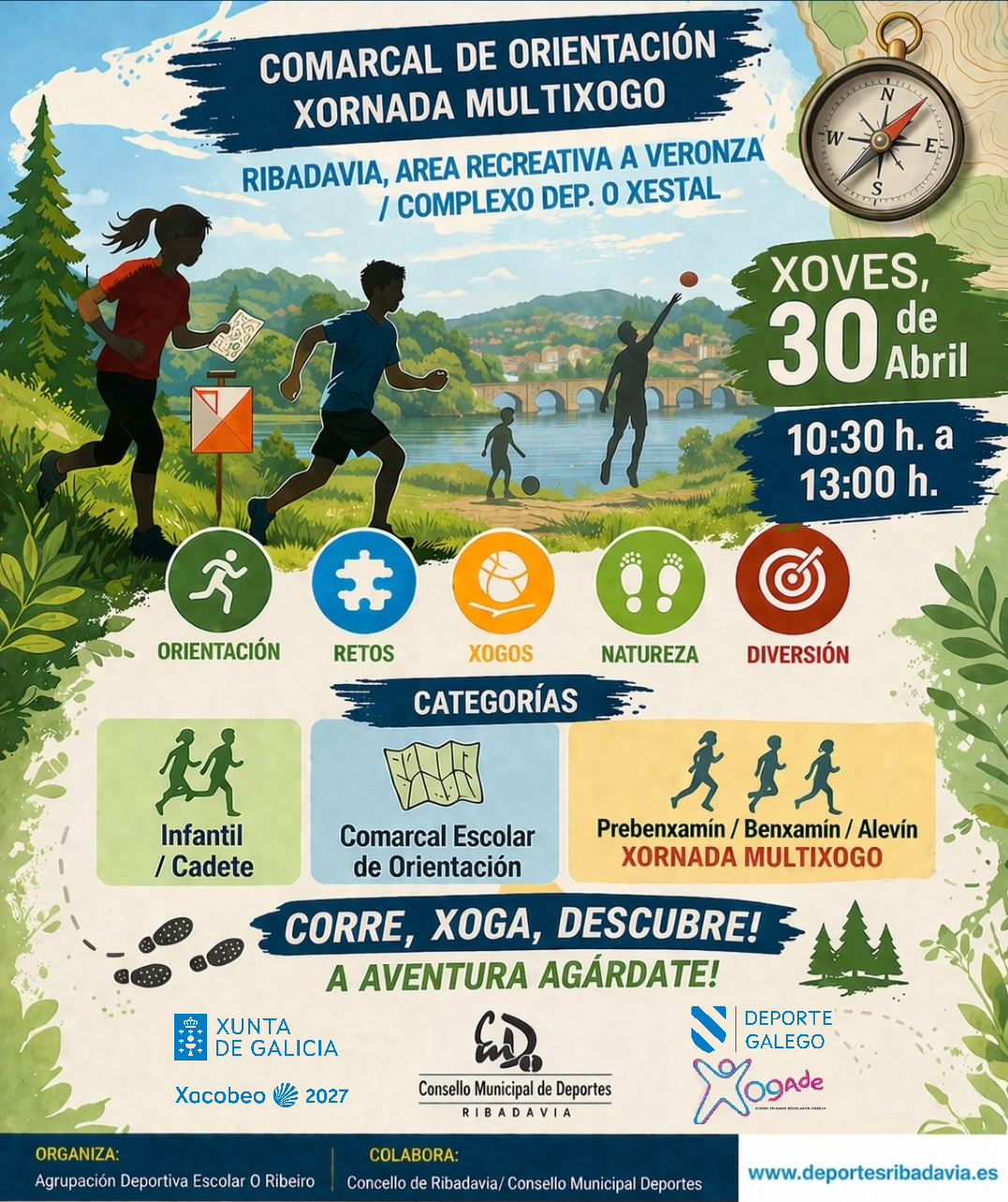 Organizado pola Agrupación Deportiva Escolar O Ribeiro coa colaboración do Concello de Ribadavia a través do Consello Municipal de Deportes, terá lugar o vindeiro luns 30 de abril nas Instalacións municipais do Novo Sintético O Xestal e Área Recreativa da Veronza a Xornada do Comarcal de Orientación e Multixogo, última actividade do curso 25/26 incluída dentro do programa XOGADE da Secretaría Xeral para o Deporte.