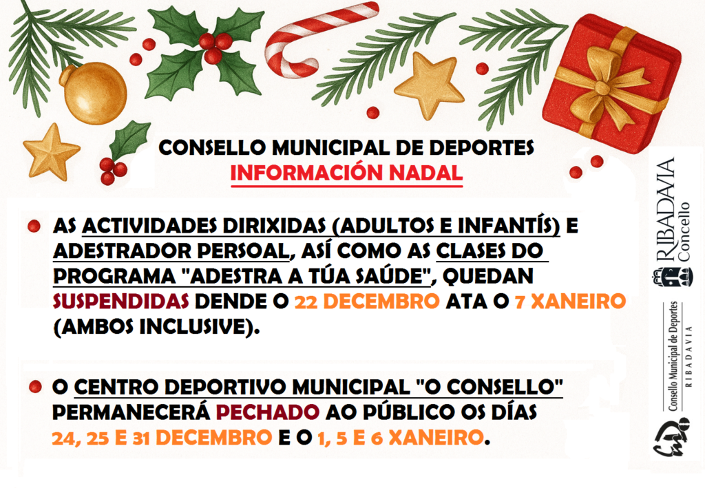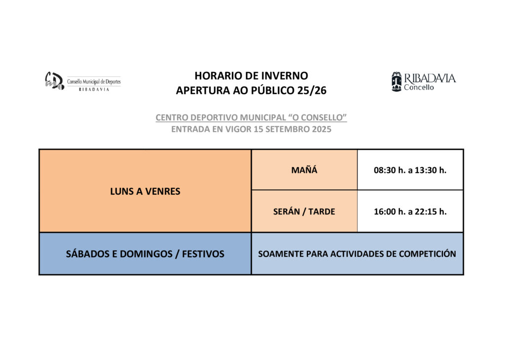 Horario de apetura ao público no Centro Deportivo Municipal "O Consello". Entrada en vigor o 15 setembro 2025 De LUNS a